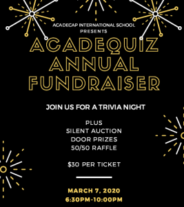 Acadecap’s annual school fundraiser, AcadeQuiz, is around the corner! Join us on March 7th, 2020 for a fun evening of trivia, drinks and more! To reserve your tickets online, click here or simply reply to this email with the number of tickets you would like. Don’t forget to invite your family and friends,