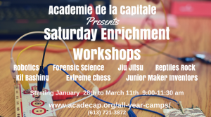 Super Saturdays (SuperSats) will not be held this coming Saturday, January 28th. The first SuperSats session will be on February 4th, featuring Jiu Jitsu (ages 5-7) and Robotics Square (ages 8-11).