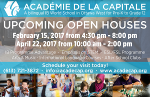 Looking for a one-stop-education in the West of Ottawa? Académie de la Capitale is hosting an Open House, Saturday, April 22nd, 2017 from 10:00 am to 2:00 pm Come and discover more about our programmes: Childcare, Preschool, PYP, MYP, and OSSD. Learn about our extra-curriculars: Crédits à la Carte, Tutoring, All-Year