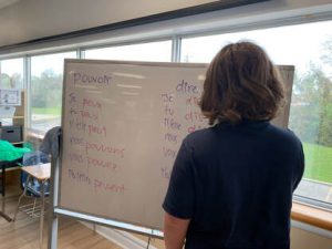 During French class, the 5/6 students were learning and reviewing verbs. The students had the choice to write sentences using the different verbs, quiz each other about the different verb tenses, or create a song with the different verbs. Many of the students chose to make a song, enthusiastically and