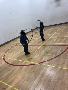 Hop, skip, jump, and roll! Hula hoops have a way of putting fun in motion. Young students interact in a variety of games involving large hula hoops. During these activities students are developing their motor skills and eye-hand coordination while playing variations of red light/green light, Simon says, and relay
