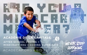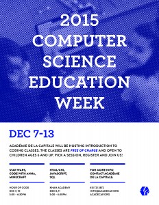 Académie de la Capitale will be holding introduction to coding classes. The classes are free of charge and open to children ages of 6 and up! Pick a session, register and join us in celebration of CS Education week and Hour of Code! CS Edu Week Registration Form